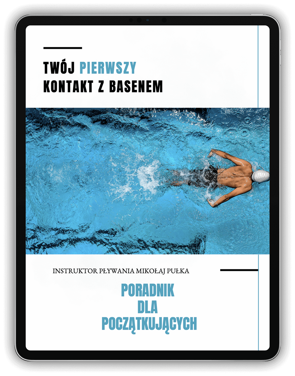 Sięgnij po e-book „Twój pierwszy kontakt z basenem” – praktyczny poradnik dla dzieci, dorosłych i rodziców, którzy chcą dobrze przygotować się do zajęć. Znajdziesz w nim konkretne wskazówki, jak pokonać stres, co zabrać na basen, jak wspierać dziecko i na co zwrócić uwagę przy wyborze instruktora.